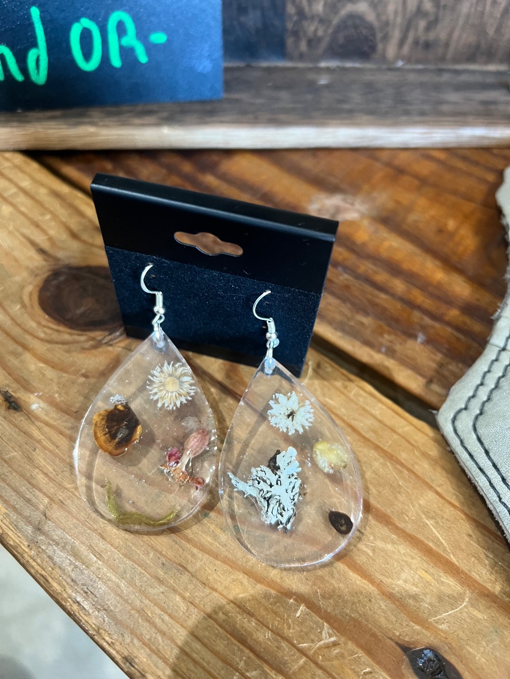 Large teardrop silver earrings with flowers, moss, and mushrooms encased inside